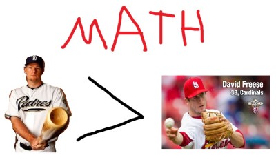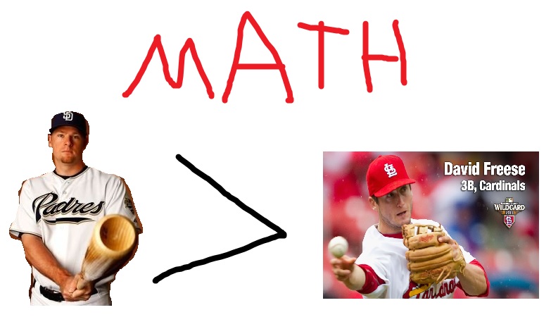 A gold glove and near MVP campaign later, it’s pretty clear that Headley is the better player. He’s showing major leadership on the team and backing it up with skills on the field and at the plate. Freese? Still a solid player. But not an MVP caliber player like Headley. To further analyze this point, I drew up the following hard hitting MATHEMATICAL analysis: