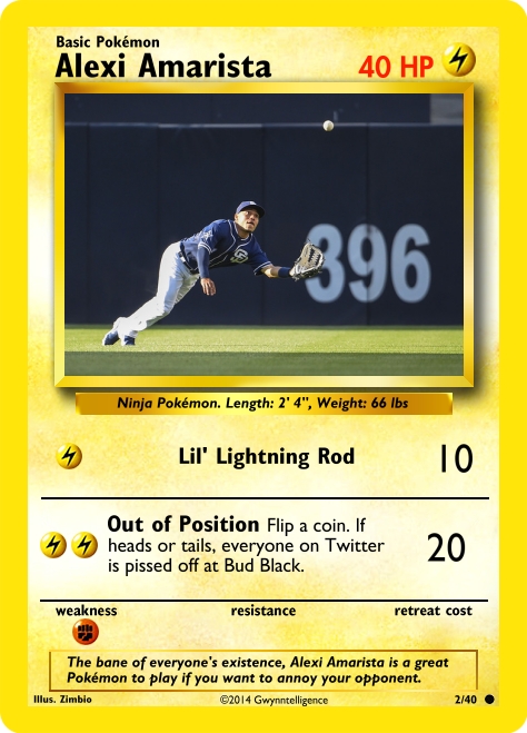 I wanted to make him resistant to common sense managerial tactics, but apparently that’s not a valid Pokemon type. Plus, when I super-imposed Bud Black’s head into the resistance area of the card, it just looked tacky.