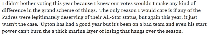 1. Arbitrating whether a player deserves to make the All Star Game: The most common argument I heard was that Alexi Amarista did not deserve to be an All Star. Of course this is the case. He’s awful. But if you think for a second that Kansas City fans thought their players deserved to be an All Star, you’d be totally missing the point. All Star voting, in and of itself, is a game with set rules. KC fans looked at the rules and exploited them. In the end, they have four All Star starters we have none. But at least our voters cast votes that they really believed in, right? Small sample size, but just a couple days ago Gaslamp Ball had a post about Justin Upton being selected for the All Star Game, and these two comments were made: