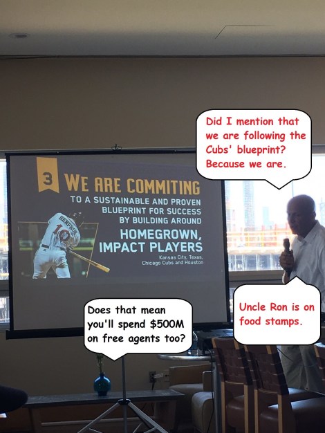 So while it’s a nice marketing technique to try to link the Padres to the World Series Champion Chicago Cubs, the Padres are not following their blueprint. I’m sure they’d like to but unless Uncle Ron is getting ready to sign the two top free agents in consecutive years and commit $500M+ to free agents, it doesn’t look like that’s the path this club is going down. And minus multiple important, highly paid contributors like Jon Lester, John Lackey, Dexter Fowler, and Ben Zobrist, the Cubs aren’t a World Champion. Nor are they basing their club entirely around “homegrown, impact players” (literally zero of their 11 pitchers were homegrown). They are following an entirely different plan that a team like the Padres just can’t afford to follow. Statements by the team pushing the narrative that the Cubs provide inspiration to a team like the Padres is just pushing false hopes and lies. It’s like telling a kid in poverty that they’re just like Bill Gates because they both wear shirts.